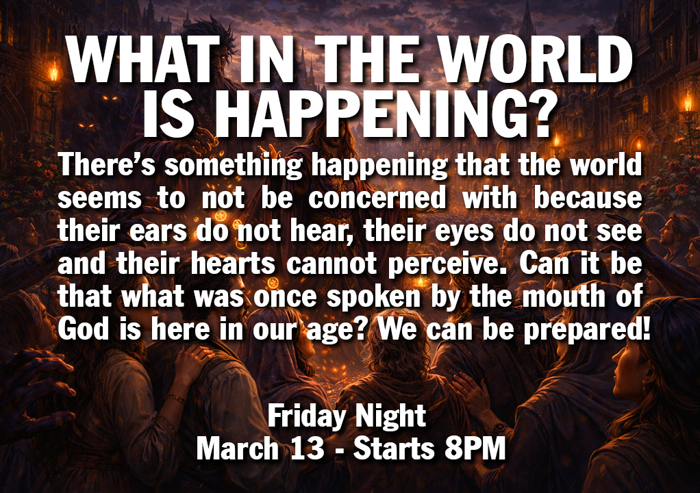 The Friday Night Pre-Service Prayer Meeting this Friday 7PM (to 7:50PM) In the Prayer Room - Even if you come after 7PM you can join in. (There will be prayer for Israel, The Middle East, America, for Revival, and for God’s power to be manifested- with the book Avatar going forth – also for power and protection against all attacks – and God’s purposes in America and the world. - in the Fireplace Room, about 30 minutes after the service.).